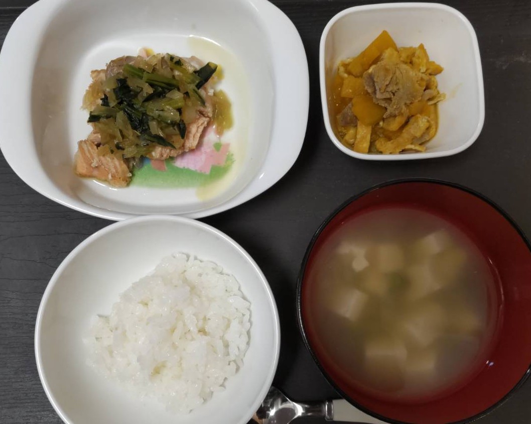 鮭の香味だれ丼かぼちゃと豚肉の信田煮味噌汁(豆腐、インゲン)豆腐って、つまむのが大人でも難しいと思いませんか?親指とひとさし指で優しくつまんで食べられるお友達が増えてきます!そ~っと、そ~っと優しくつまんで口に入れるまでの表情がとてもかわいいです(*^_^*)