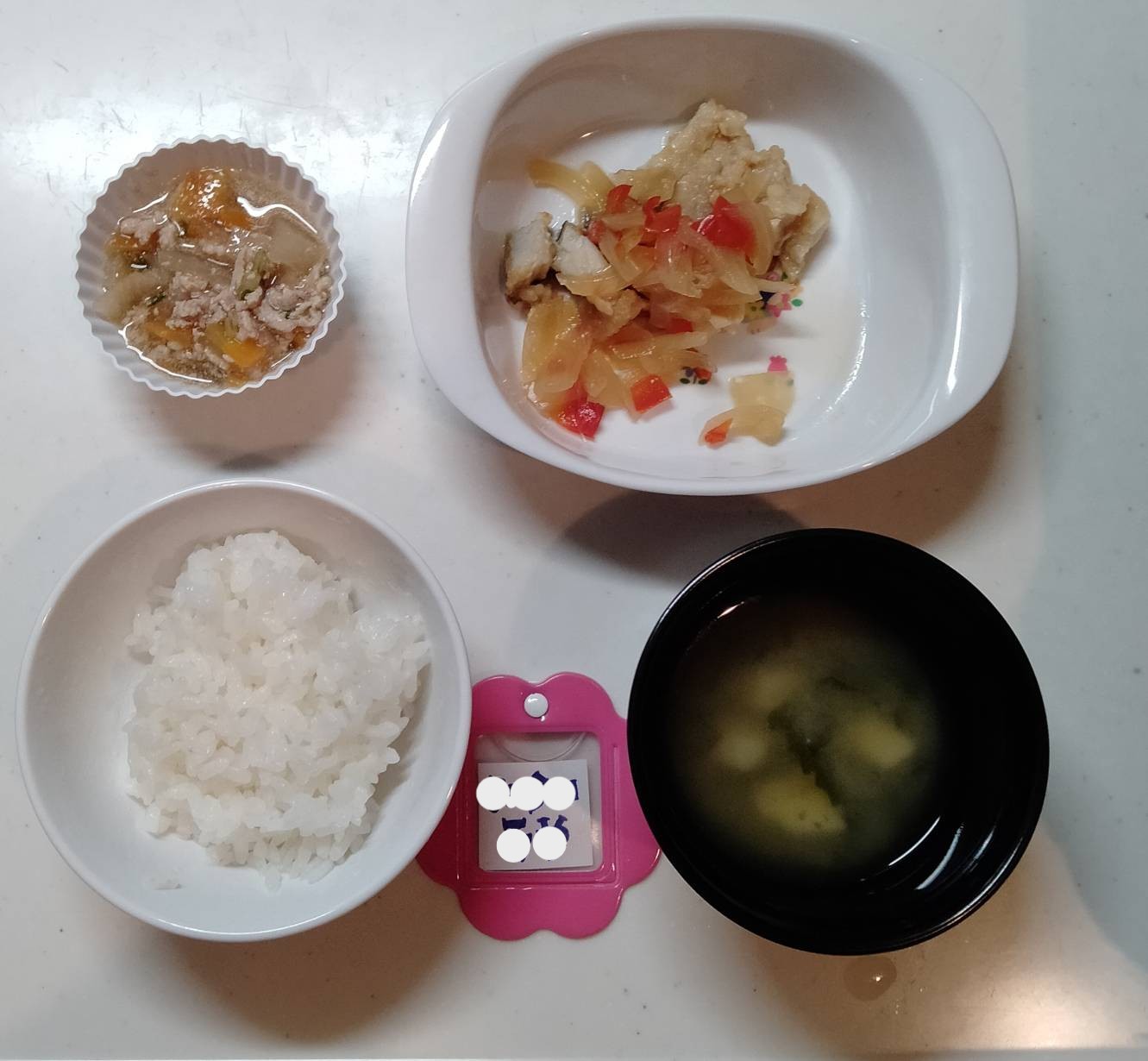 ふりかけご飯タラの甘酢漬け豚肉と大根の炒め煮みそ汁(わかめ・麩)