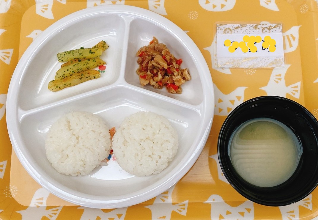 ごはん鶏肉と野菜の煮物(玉ねぎ・人参・ごぼう)磯焼きポテトお味噌汁(麩・いんげん)