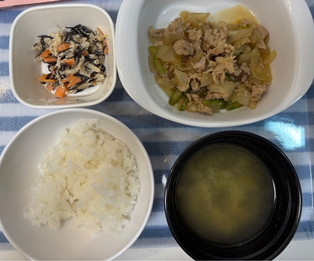 ご飯豚肉とアスパラの生姜炒め切干大根のひじきサラダみそ汁(小松菜、ごぼう)食べやすいように小さくカットをしていても豚肉に火を通すと、どうしても、塊になりがちです。食器に盛り付けをした後にも、気になる大きさがあれば、カットをしています。お口の中に入れて、カミカミカミカミ・・・ゴックン(#^.^#)そんな声を掛けながら、楽しくいただきました(*^_^*)