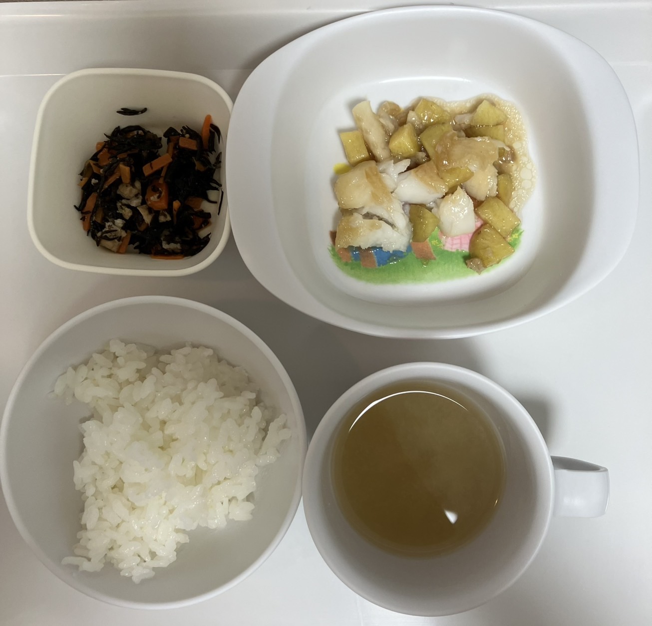 ごはんカレイのコロコロ揚げひじきの炒り煮みそ汁(玉ねぎ、キャベツ)