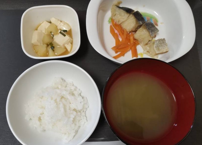 ごはんたらの蒲焼風じゃがいもの豆腐煮みそ汁(白菜、わかめ)豆腐をカットして20分ほど弱火で下茹でし鍋のまま、置いておきます。じゃがいもと合わせて味つける時には、煮崩れもせず、味か染みてとてもおいしかったですよ(#^.^#)