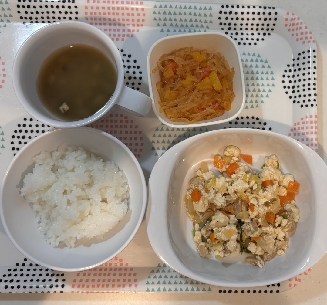 ごはん豆腐と鶏肉のうま煮春雨とトマトのサラダみそ汁(なす、ねぎ)9月にはいって、ナスさんが大活躍です!子ども達が持ちやすいカップで、お味噌汁を用意しています。スプーンでナスがすくいやすいように、1センチ程度にカットしている園もあります。ナスとお味噌の相性はバッチリです!