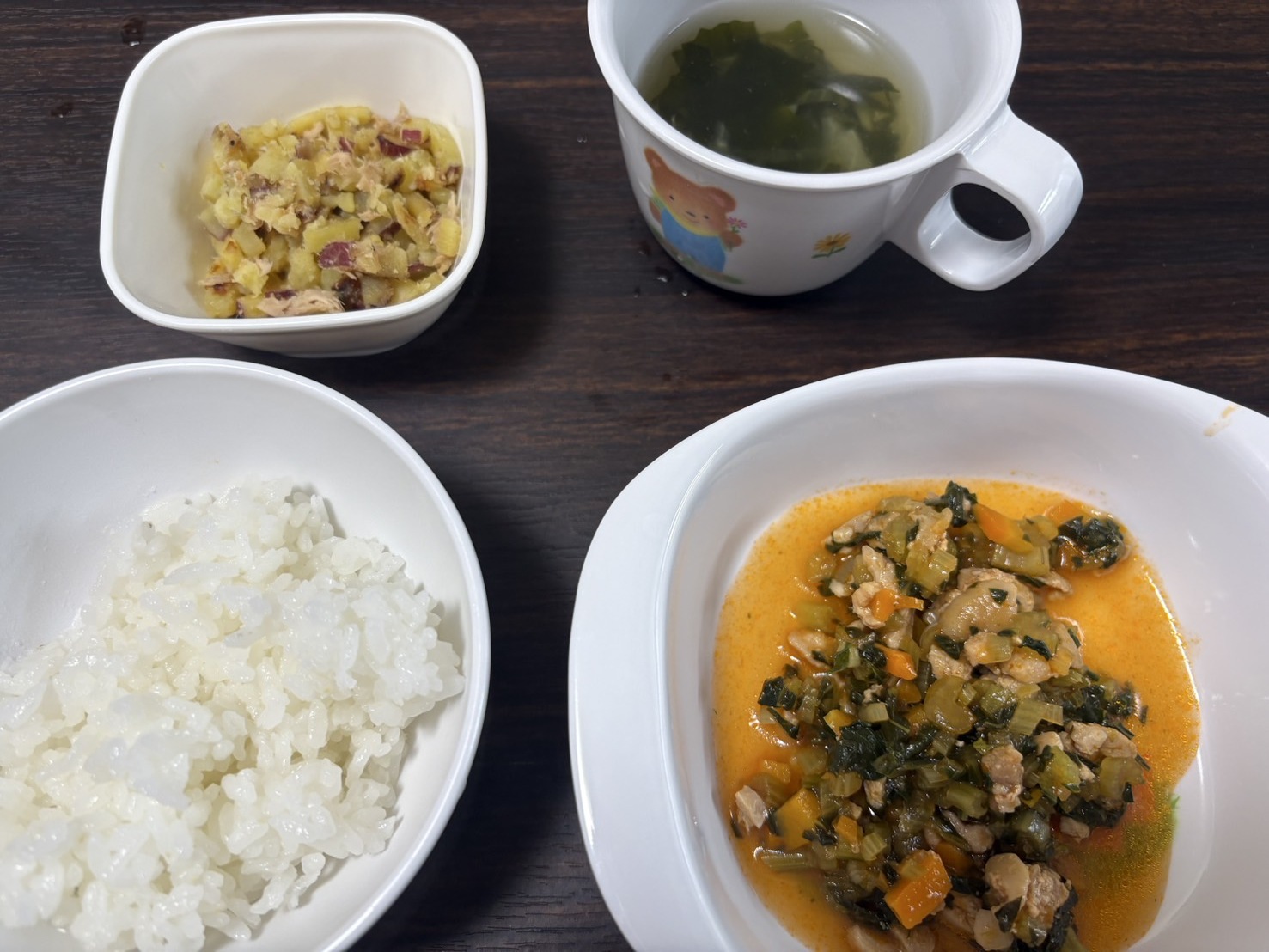 ごはん鶏肉のケチャップ煮さつまいものツナ炒めスープ(大根とわかめ)スーパーなどで手軽に焼き芋が買えるようになり、さつまいものブームはまだまだ続きそうですね!さつま芋の旬は、秋です!今月に入り、さつまいもをモチーフにした楽しい歌声も、響き渡ります♡