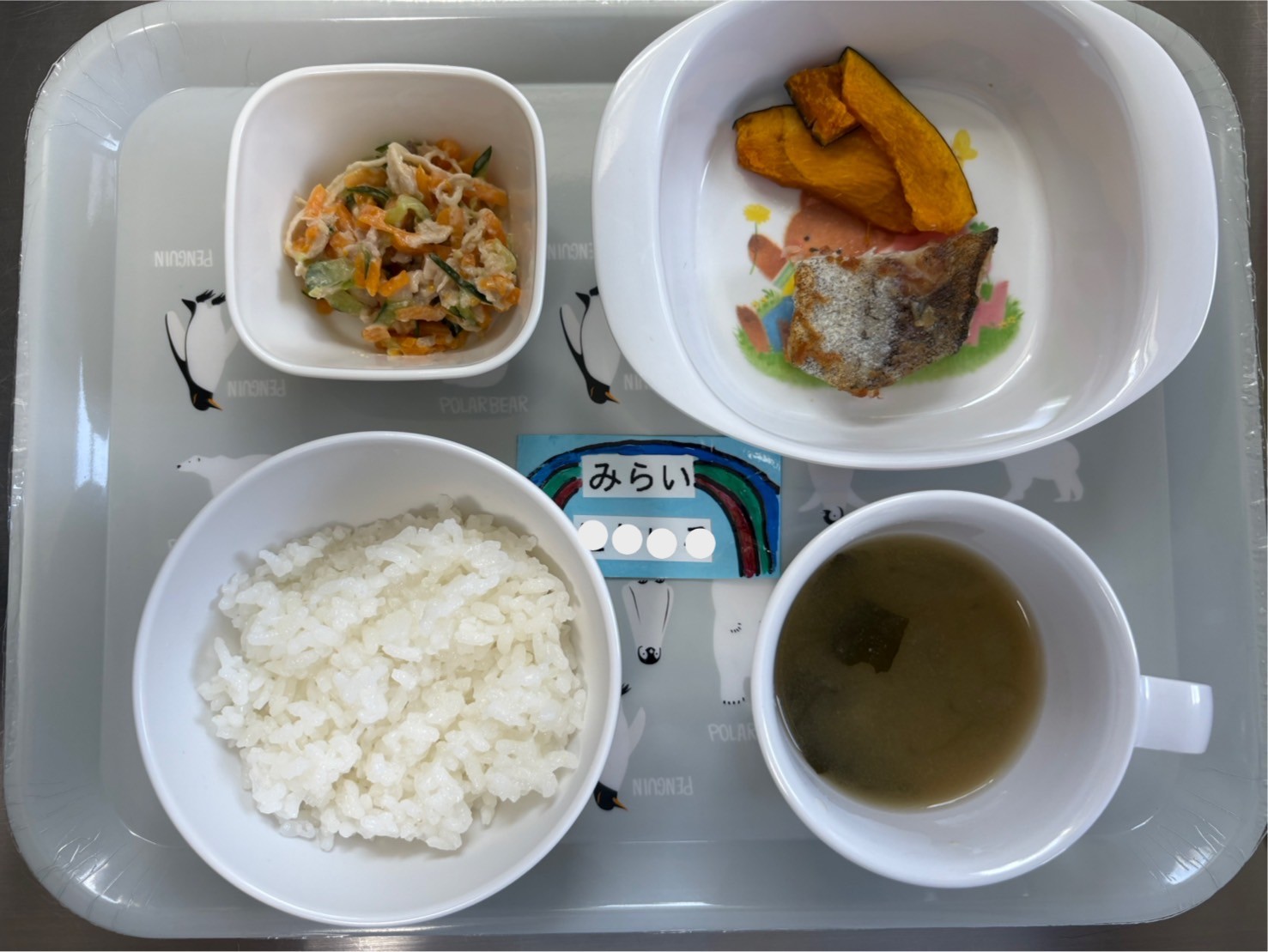 ふりかけご飯タラのバター焼きゆで豚ときゅうりのマヨ醤油和えみそ汁(大根・わかめ)