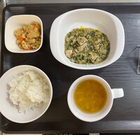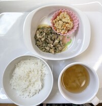ごはん鶏肉のきのこあん炒り粉豆腐みそ汁(きゃべつ、麩)